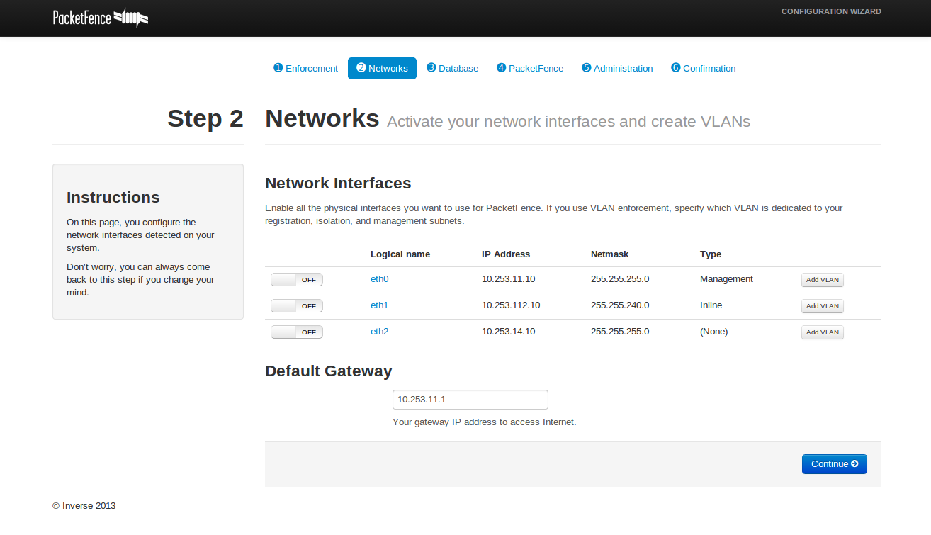 | Description | Installed packetfence as per Ubuntu install instructions on 12.04.2, only SSH installed before apt-get install packetfence which attempted to install 4.0.1. Load up configurator, select inline enforcement. See in attached screenshot all interfaces are Off, interfaces are configured for management and inline. Clicking the toggle button for each interface gives the error "Interface eth0 has not been enabled. Should check server side logs for details". Server side logs includes this error message and nothing more. Clicking continue gives the error message "Invalid gateway. Doesn't belong to any running and configured interface" Log files provide no additional information, all interfaces are configured as manual in /etc/network/interfaces and are currently up and working correctly. root@proxy01:/usr/local/pf# ifconfig eth0 Link encap:Ethernet HWaddr 00:50:56:b0:89:eb inet addr:10.253.11.10 Bcast:10.253.11.255 Mask:255.255.255.0 inet6 addr: fe80::250:56ff:feb0:89eb/64 Scope:Link UP BROADCAST RUNNING MULTICAST MTU:1500 Metric:1 RX packets:135635 errors:0 dropped:0 overruns:0 frame:0 TX packets:47142 errors:0 dropped:0 overruns:0 carrier:0 collisions:0 txqueuelen:1000 RX bytes:155619543 (155.6 MB) TX bytes:8873996 (8.8 MB) eth1 Link encap:Ethernet HWaddr 00:50:56:b0:71:81 inet addr:10.253.112.10 Bcast:10.253.127.255 Mask:255.255.240.0 inet6 addr: fe80::250:56ff:feb0:7181/64 Scope:Link UP BROADCAST RUNNING MULTICAST MTU:1500 Metric:1 RX packets:33928 errors:0 dropped:0 overruns:0 frame:0 TX packets:28269 errors:0 dropped:0 overruns:0 carrier:0 collisions:0 txqueuelen:1000 RX bytes:3388083 (3.3 MB) TX bytes:25562726 (25.5 MB) eth2 Link encap:Ethernet HWaddr 00:50:56:b0:8a:10 inet addr:10.253.14.10 Bcast:10.253.14.255 Mask:255.255.255.0 inet6 addr: fe80::250:56ff:feb0:8a10/64 Scope:Link UP BROADCAST RUNNING MULTICAST MTU:1500 Metric:1 RX packets:300 errors:0 dropped:0 overruns:0 frame:0 TX packets:10108 errors:0 dropped:0 overruns:0 carrier:0 collisions:0 txqueuelen:1000 RX bytes:19926 (19.9 KB) TX bytes:860993 (860.9 KB) lo Link encap:Local Loopback inet addr:127.0.0.1 Mask:255.0.0.0 inet6 addr: ::1/128 Scope:Host UP LOOPBACK RUNNING MTU:16436 Metric:1 RX packets:1032 errors:0 dropped:0 overruns:0 frame:0 TX packets:1032 errors:0 dropped:0 overruns:0 carrier:0 collisions:0 txqueuelen:0 RX bytes:7602361 (7.6 MB) TX bytes:7602361 (7.6 MB) | |||||||