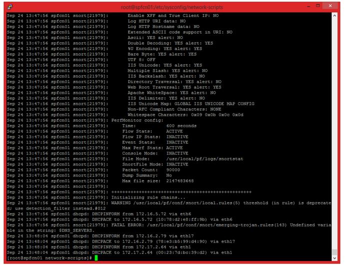 | Description | Snort suddenly not working after a packetfence service restart. On /var/log/messages, it shows that it has a problem on a variable $DNS_SERVERS and When I run the cat /var/log/messages and got FATAL Error on snort as shown below: Sep 25 13:00:05 spfcn01 snort[26763]: FATAL ERROR: /usr/local/pf/conf/snort/emerging-trojan.rules(143) Undefined variable in the string: $DNS_SERVERS. and the I run cat /usr/local/pf/conf/snort.conf and edit the: var DNS_SERVERS [%%dnsservers%%] and changed to: var DNS_SERVERS [%%dns_servers%%] and then restarted again the packetfence and the result, snort service is now running. | |||||||