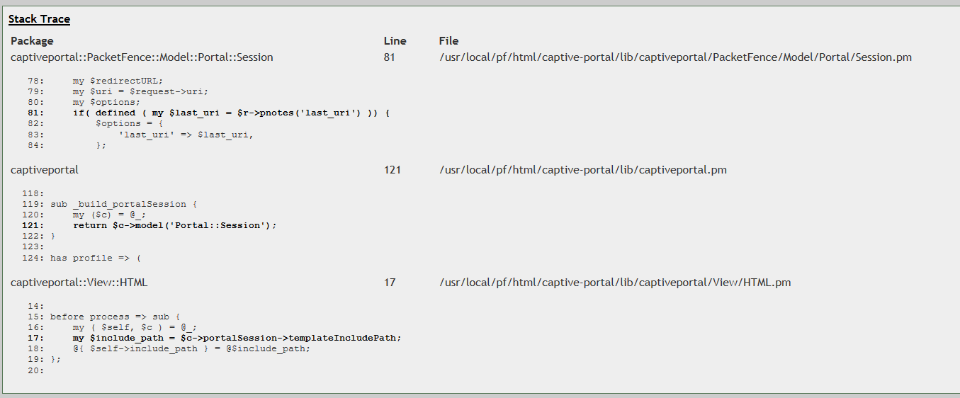 txt_message => "Caught exception in captiveportal::Controller::Root->setupCommonStash \"Can't call method \"pnotes\" on an undefined value at /usr/local/pf/html/captive-portal/lib/captiveportal/PacketFence/Model/Portal/Session.pm line 81.\" Caught exception in captiveportal::Controller::Root->getLanguages \"Can't call method \"pnotes\" on an undefined value at /usr/local/pf/html/captive-portal/lib/captiveportal/PacketFence/Model/Portal/Session.pm line 81.\" Caught exception in captiveportal::Controller::Root->setupLanguage \"Can't use string (\"0\") as an ARRAY ref while \"strict refs\" in use at /usr/local/pf/html/captive-portal/lib/captiveportal/PacketFence/Controller/Root.pm line 123.\" Caught exception in captiveportal::Controller::CaptivePortal->validateMac \"Can't call method \"pnotes\" on an undefined value at /usr/local/pf/html/captive-portal/lib/captiveportal/PacketFence/Model/Portal/Session.pm line 81.\" Caught exception in captiveportal::Controller::CaptivePortal->nodeRecordUserAgent \"Can't call method \"pnotes\" on an undefined value at /usr/local/pf/html/captive-portal/lib/captiveportal/PacketFence/Model/Portal/Session.pm line 81.\" Caught exception in captiveportal::Controller::CaptivePortal->checkForViolation \"Can't call method \"pnotes\" on an undefined value at /usr/local/pf/html/captive-portal/lib/captiveportal/PacketFence/Model/Portal/Session.pm line 81.\" Caught exception in captiveportal::Controller::CaptivePortal->checkIfNeedsToRegister \"Can't call method \"pnotes\" on an undefined value at /usr/local/pf/html/captive-portal/lib/captiveportal/PacketFence/Model/Portal/Session.pm line 81.\" Caught exception in captiveportal::Controller::CaptivePortal->checkIfPending \"Can't call method \"pnotes\" on an undefined value at /usr/local/pf/html/captive-portal/lib/captiveportal/PacketFence/Model/Portal/Session.pm line 81.\" Caught exception in captiveportal::Controller::CaptivePortal->unknownState \"Can't call method \"pnotes\" on an undefined value at /usr/local/pf/html/captive-portal/lib/captiveportal/PacketFence/Model/Portal/Session.pm line 81.\"",