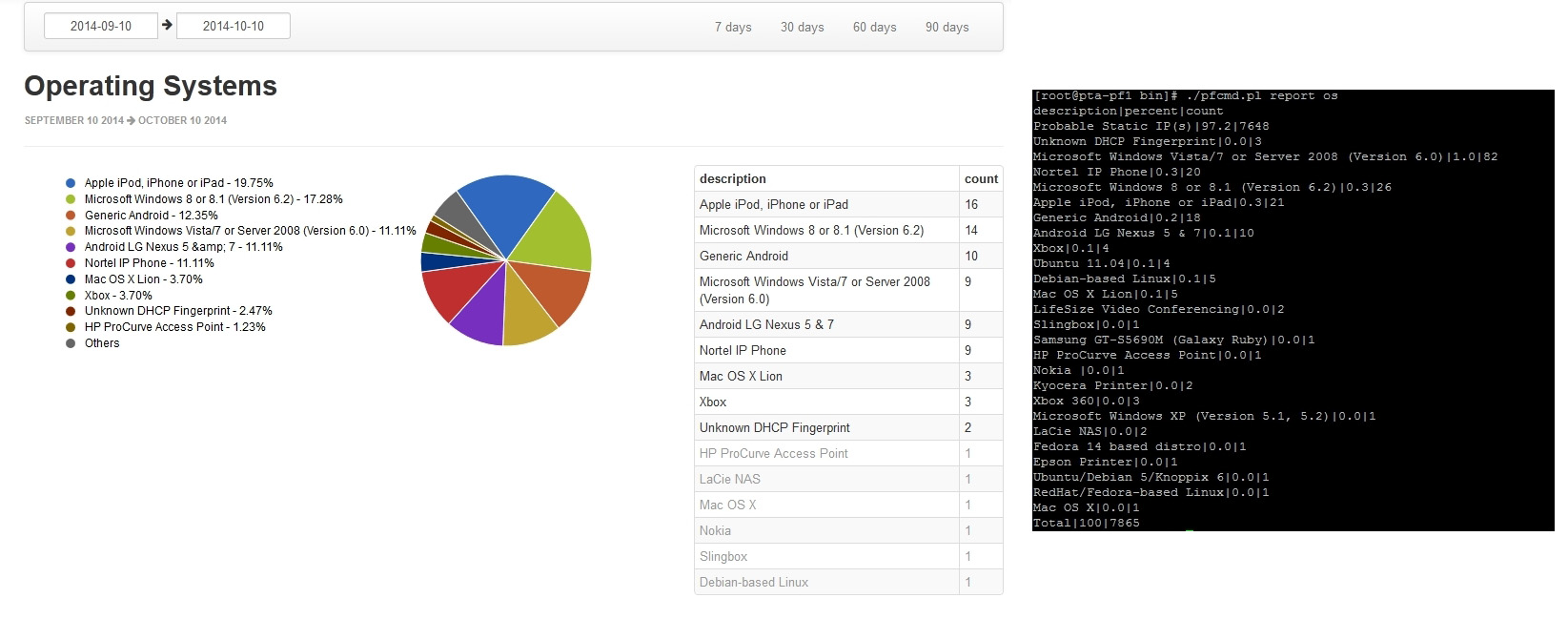 I can not find the numbers provided via CLI - "./pfcmd.pl report os" - in the GUI regardless of the date range selected.