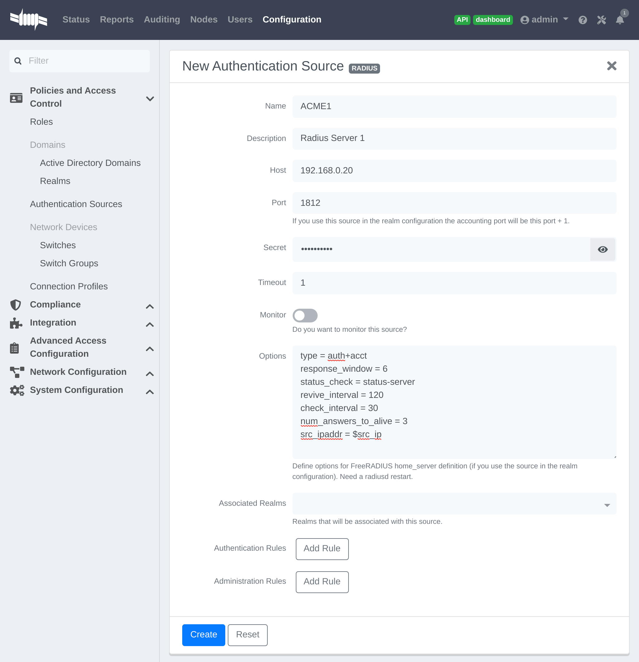 Once your pfconnector is started, you can now point your network equipment to use the pfconnector’s IP address for RADIUS and the captive portal like you would do with a typical on-premise PacketFence server. When defining the RADIUS secret in PacketFence and in your network equipment, always use the value inside /usr/local/pf/conf/local_secret.
